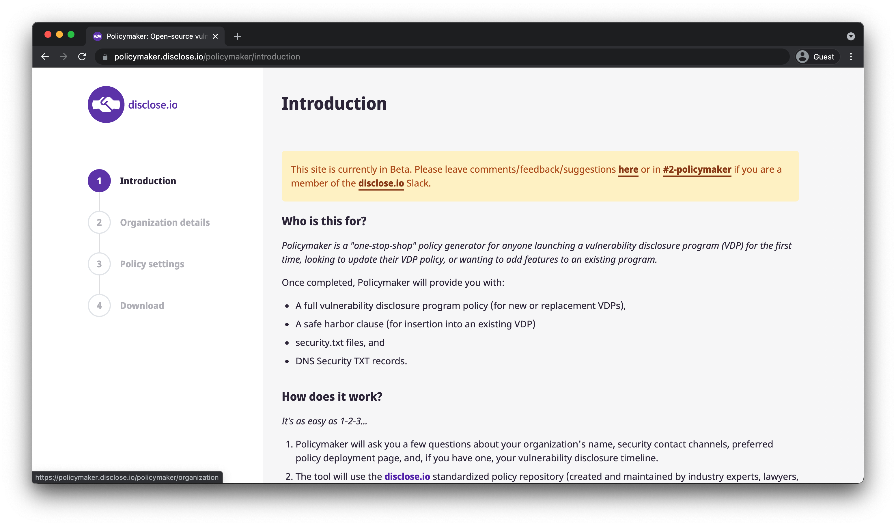 - The tool will use the disclose.io standardized policy repository (created and maintained by industry experts, lawyers, and legal teams of large organizations that run VDPs) to create a policy just for you.